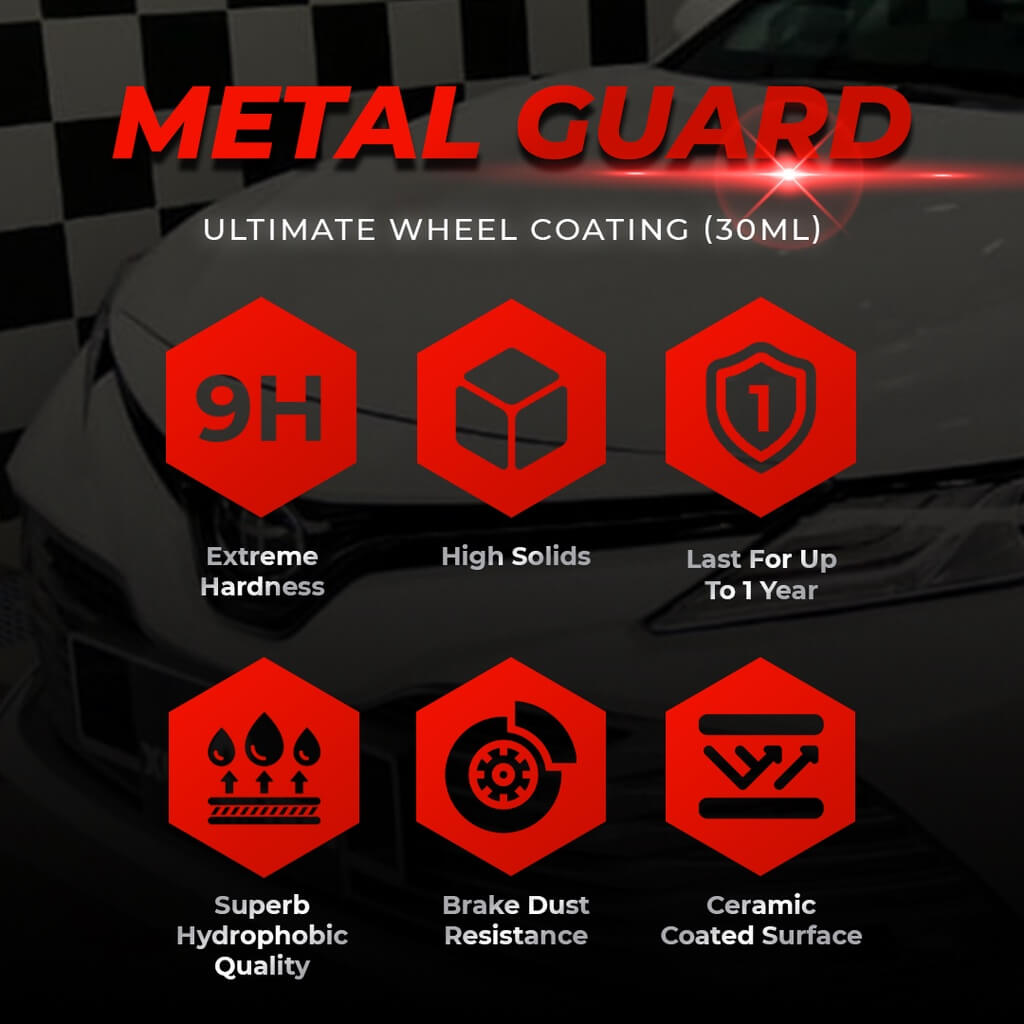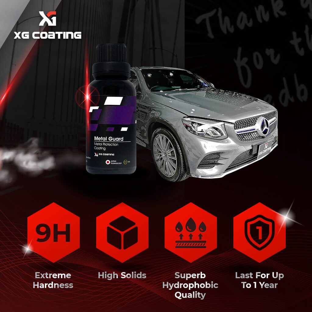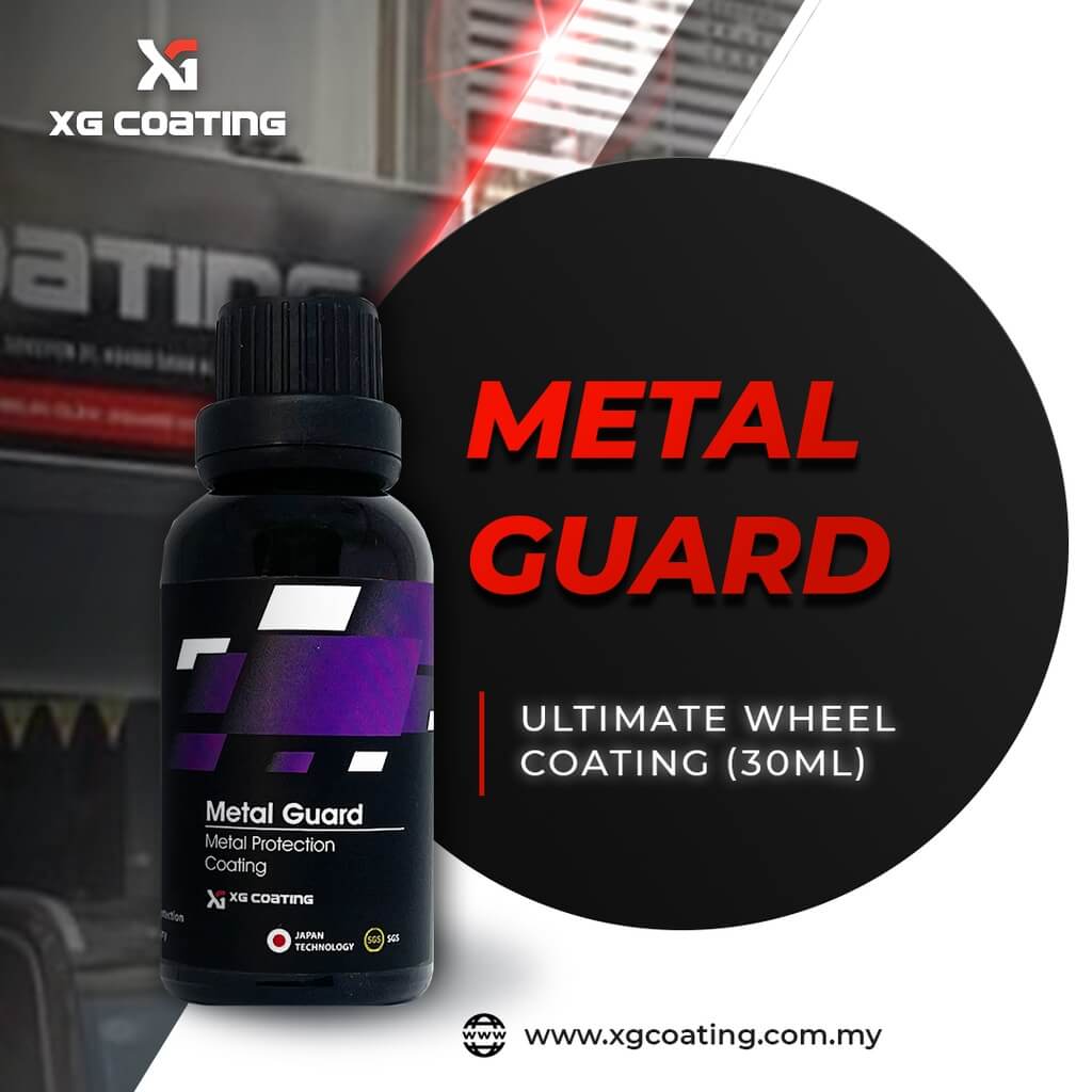 XG Metal Guard is a REACH 9H compliant, synthesized using nanotechnology ceramic coating for wheels which contains more than 90% of active material in it formula. It forms an interlocking glass-like finish on a molecular level with amazing protection. The result is the ceramic coated surface will have a higher resistance against high temperature brake dust, micro marring, chemical attack and staining that will last for up to 1 year.