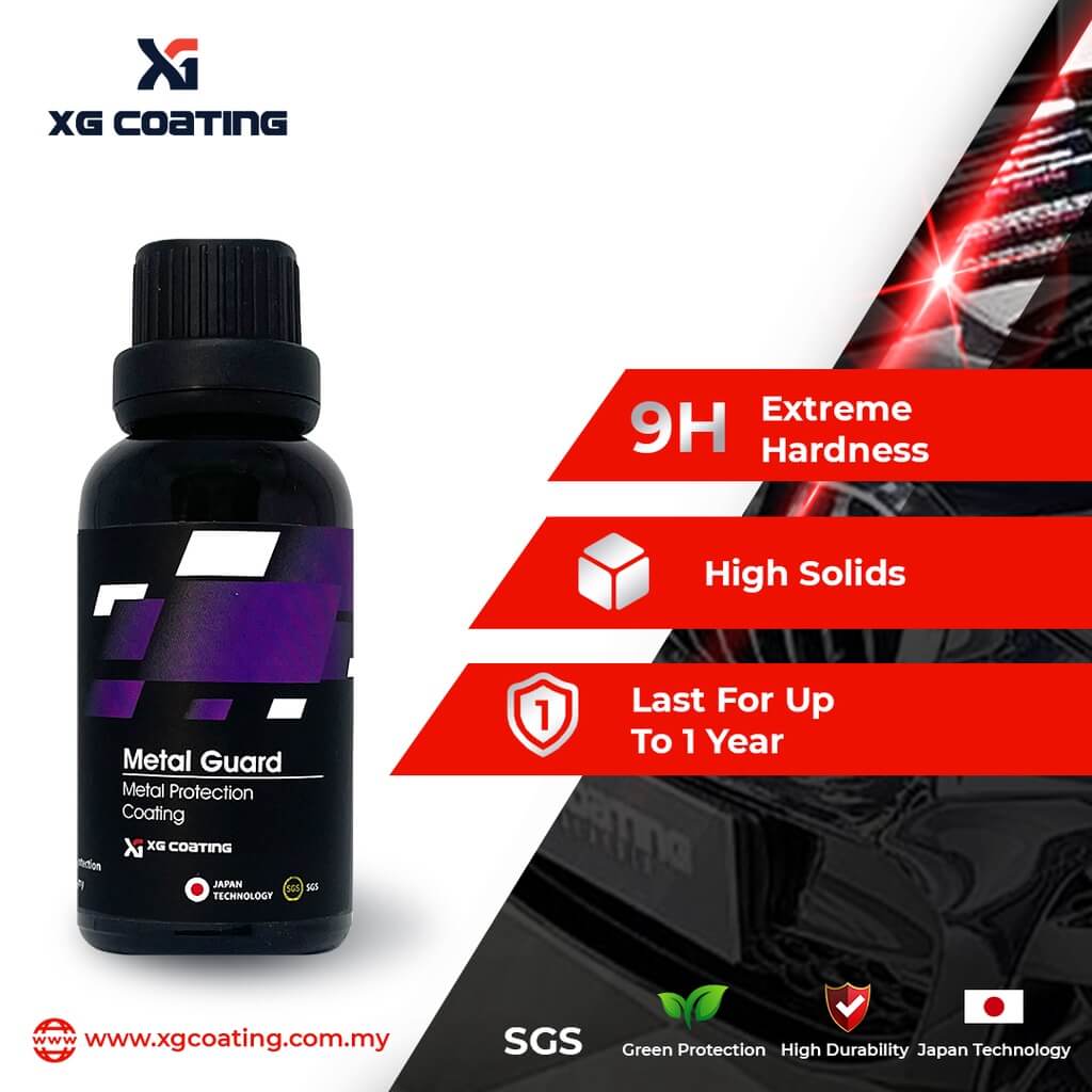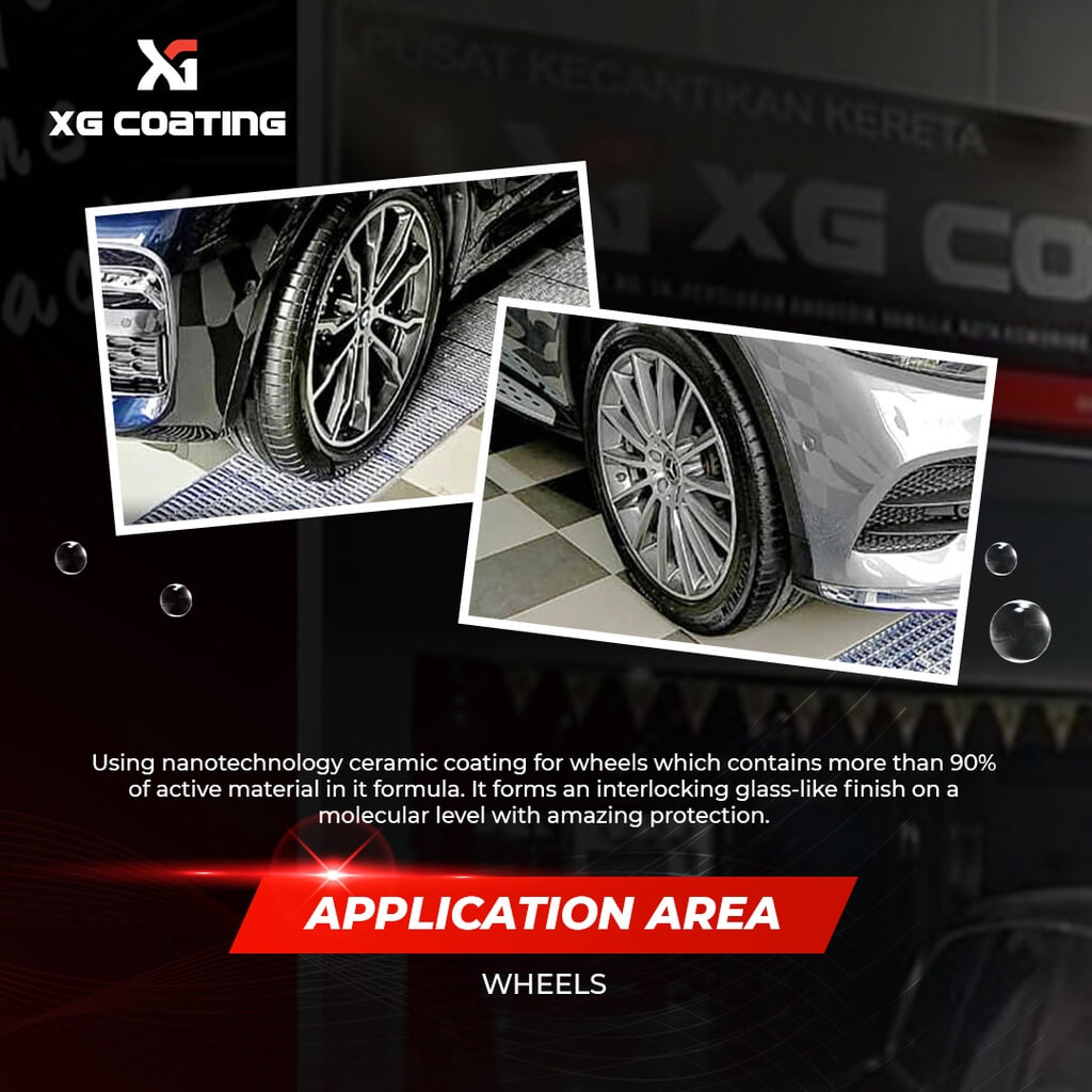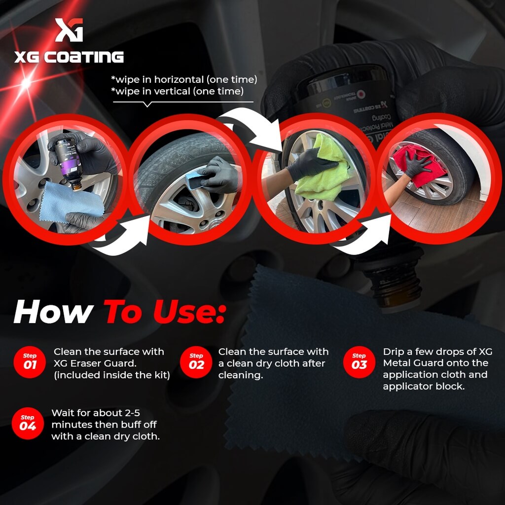 XG Metal Guard is a REACH 9H compliant, synthesized using nanotechnology ceramic coating for wheels which contains more than 90% of active material in it formula. It forms an interlocking glass-like finish on a molecular level with amazing protection. The result is the ceramic coated surface will have a higher resistance against high temperature brake dust, micro marring, chemical attack and staining that will last for up to 1 year.